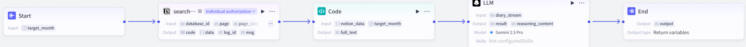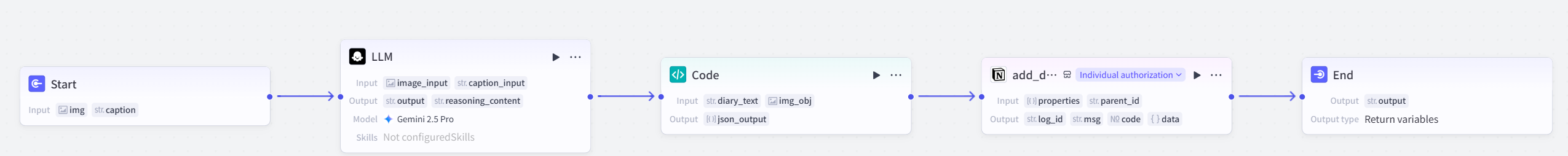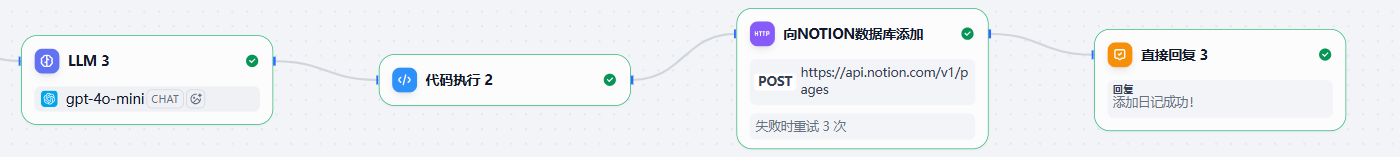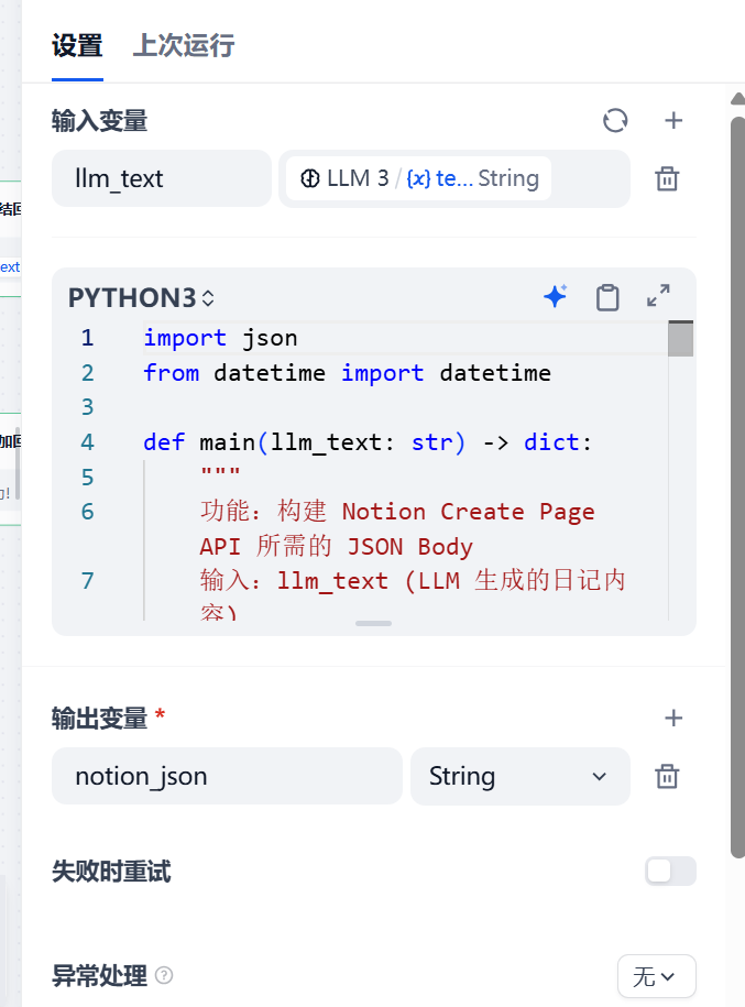 概述:用户输入以后LLM去分析输出文本,传递给代码逻辑块,将分析的结果打包为可以被Coze的notion节点接受的类型,然后由Notion插件将内容提交发送,最后由end节点输出结果