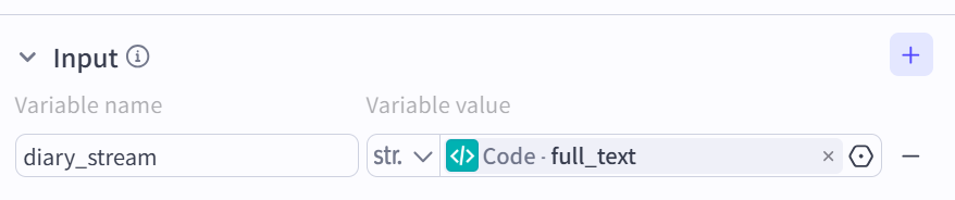 添加code块,input参数为LLM节点的输出结果,output参数是