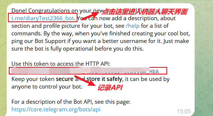 /newbot,并输入你制定的机器人名字,要以bot作为后缀根据图片提示操作即可