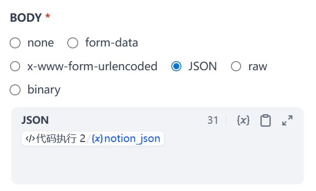 POST 请求 url = "https://: https://api.notion.com/v1/pages" headers = { 'Content-Type': "application/json", 'Notion-Version': "2022-06-28", 'Authorization': "Bearer <此处改为你获取到的集成KEY>"#注意Bearer和你的KEY中间是有空格的 } body { "page_size": 100, "sorts": [ { "property": "Date", "direction": "descending" } ] }代码执行节点:将notion请求返回的数据加工处理