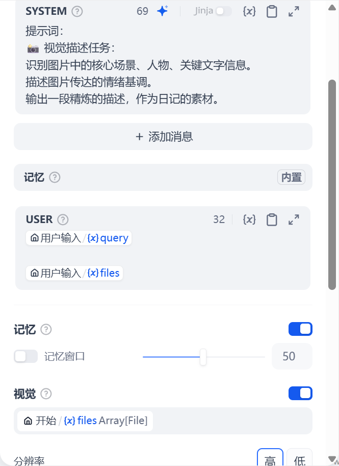 开启记忆以及视觉,并添加好开始节点传入的文件参数