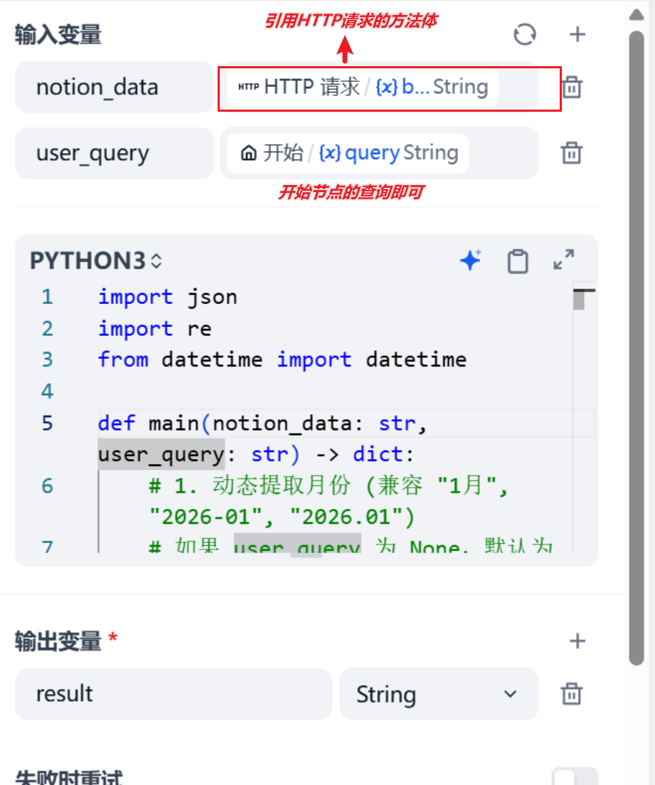import json import re from datetime import datetime def main(notion_data: str, user_query: str) -> dict: # 1. 动态提取月份 (兼容 "1月", "2026-01", "2026.01") # 如果 user_query 为 None,默认为空字符串 query = str(user_query) if user_query else "" match = re.search(r"(\d{4})[-/.](\d{1,2})|(\d{1,2})月", query) if match: groups = match.groups() # 提取年份,如果没有则默认为今年 year = groups[0] if groups[0] else datetime.now().year # 提取月份 month = groups[1] if groups[1] else groups[2] target_month = f"{year}-{int(month):02d}" else: target_month = datetime.now().strftime("%Y-%m") # 2. 解析 JSON 数据 try: # Dify 有时会直接传入 Dict,有时是 String,做个容错 if isinstance(notion_data, dict): data = notion_data else: data = json.loads(notion_data) if notion_data else {} results = data.get('results', []) except Exception as e: return {"result": f"JSON解析错误: {str(e)}"} # 3. 数据清洗与过滤 cleaned_logs = [] for page in results: try: props = page.get('properties', {}) # --- 日期处理 (修复崩溃点) --- date_prop = props.get('Date', {}) # 检查 date_prop 是否存在,且 'date' 字段是否不为 None if not date_prop or not date_prop.get('date'): continue date_str = date_prop.get('date', {}).get('start', "") if not date_str: continue # --------------------------- # --- 内容处理 --- # 兼容你的字段名 LogContent log_content = props.get('LogContent', {}) rich_text = log_content.get('rich_text', []) content = "".join([t.get('plain_text', "") for t in rich_text]) # 执行过滤:匹配月份 且 内容不为空 if target_month in date_str and content: cleaned_logs.append(f"[{date_str}]: {content}") except Exception as e: # 遇到单条坏数据跳过,不要崩掉整个程序 continue # 4. 构建返回结果 full_text = "\n\n".join(cleaned_logs) # 这里的 Key 'result' 必须对应 Dify 节点右侧 '输出变量' 的名字 return { "result": full_text if full_text else "SYSTEM_NO_DATA_FOUND" }LLM节点:将加工的信息进行总结反馈