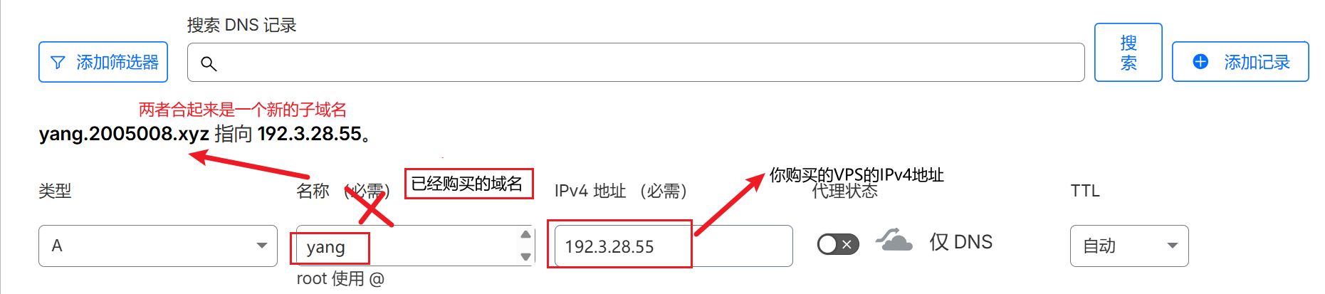 购买域名,通过Cloudflare进行域名管理,然后添加域名解析,解析到你的服务器,也就是说你访问域名,就是访问到Cloudflare,然后Cloudflare再访问你的服务器